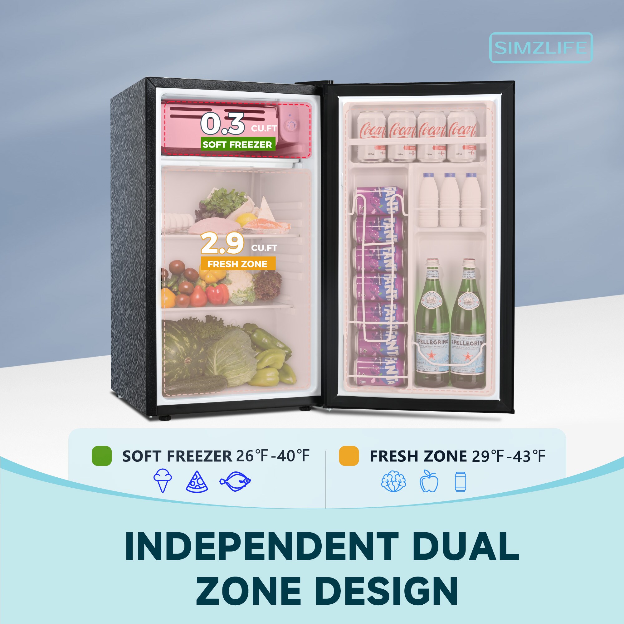 2.9 cu ft refrigeration section (21°F to 42°F) and 0.3 cu ft mini-refrigeration section (15°F to 28°F)