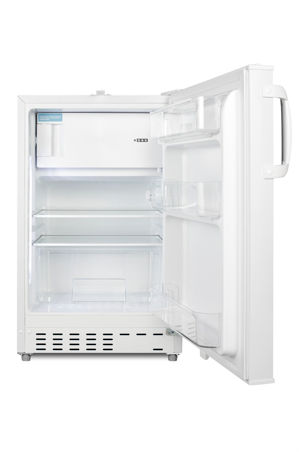 Summit Appliance offers a wide range of built-in undercounter refrigerator-freezers designed for installation under lower ADA compliant counters, with advanced features for user convenience.The ALRF48 is sized at 32″ high to fit under lower counters complying with ADA guidelines for accessibility. The fully finished textured white cabinet allows freestanding use, while the front-breathing system means this unit can be built-in with minimum clearance. The user-reversible door is 3″ thick for efficient insulation, with a handle included for added convenience. This unit comes with a right angle cord to allow for easier placement without added depth. A factory-installed lock is conveniently located towards the top of the door to provide security as needed. Inside, the ALRF48 features an all-white interior for easy cleaning and viewing of contents. Static manual defrost operation provides efficient cooling inside the 2.68 cu.ft. interior, while the dial thermostat makes temperature management simple. An automatic LED light located toward the front of the unit attractively illuminates the interior when the door opens. Three spill-proof adjustable glass shelves offer flexible storage options for large and small items, while a pull-out crisper drawer provides storage for fruits and vegetables. Three removable door racks accommodate additional storage as needed. This unit includes a compact freezer compartment with a cover. With its compact size and convenient features, the ALRF48 is the perfect unit for offices, dormitories, and other residential settings in need of an easy-fitting refrigerator-freezer.
