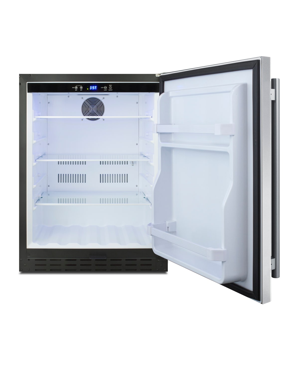 SUMMIT features built-in undercounter all-refrigerators designed for installation under lower ADA compliant counters, with advanced features for user convenience.The AL55 refrigerator is ETL-S listed to NSF-7 for commercial use and also meets residential standards. The front-breathing design allows built-in installation, while the fully finished black cabinet also enables freestanding use. Sized just under 32 inches high and 24 inches wide, this unit makes an ideal fit under lower ADA compliant counters. The user-reversible door comes in a stainless steel finish with warm undertones and vertical grain, and a pro style handle provides a professional, elegant look for any setting. A temperature alarm offers added security should the temperature go beyond the setpoint, and the optional Sabbath Mode can be used to disable certain electrical features during periods of religious observance. The automatic defrost system keeps the unit running efficiently with little user maintenance, and the internal fan ensures the unit is evenly cooled. Inside, the AL55 has a digital control panel which allows you to manage the unit’s temperature with ease. An adjustable temperature range between 36 and 46ºF ensures contents are kept cold. Three easy-glide glass shelves that extend 50% provide flexible storage, and the shelving brake system keeps unit contents safe when loading and unloading. Two door racks are ideal for keeping condiments within easy reach, while the slotted floor ensures easy storage of bottles. The dimmable soft LED lighting in a gentle blue hue with three brightness settings offers an attractive and efficient presentation inside the white interior.With its advanced user features and versatile design, the AL55 is an excellent addition to any ADA compliant setting looking for a refrigerator with a modern, elegant look.