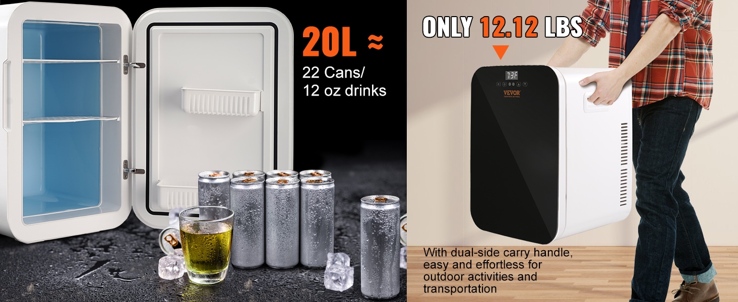 Compact but Spacious: Our mini-fridge features a small body, but it can hold up to 22 cans of 330ml beverage in its 20L capacity, weighing only 12.12lbs; Both sides are equipped with carrying handles to make it portable and easy to carry, ideal for storing food, drinks, breast milk, skincare products, medicine, and more;