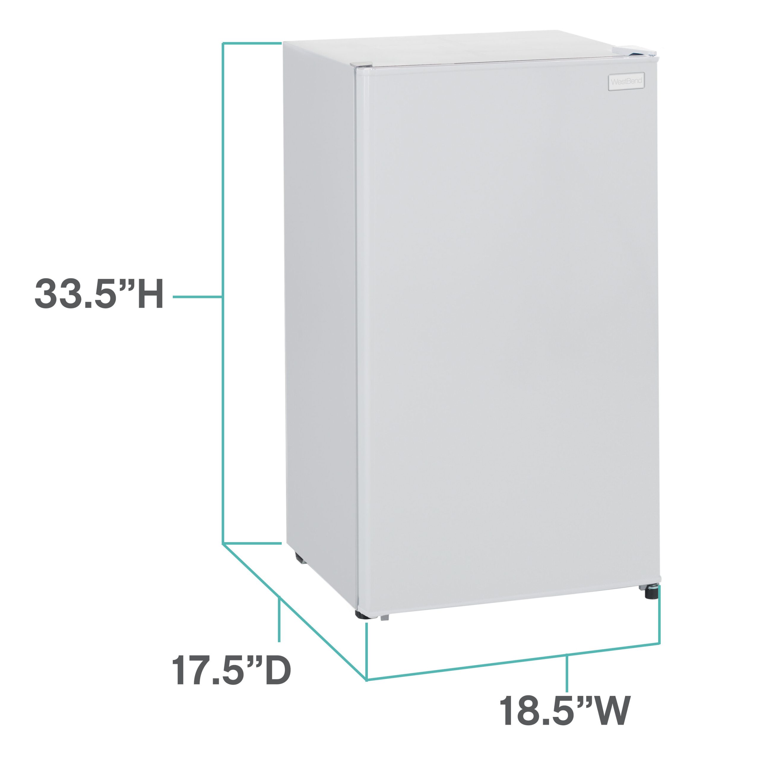 Keep your favorite beverages and snacks close by in the 3.3 cubic foot refrigerator from West Bend. Ideal for anywhere you need a little extra refrigerator space, the compact size makes it the perfect mini fridge for the office, dorm, man cave, she shed, bar, bedroom and more. Stock the mini fridge with bottled water and soda cans or try using it as a dedicated beer cooler or wine fridge. Adjustable door bins can accommodate 2 liter bottles as well as other drinks, condiments and more. Arrange the adjustable glass shelves to store salads, fruits, snacks and other food for easy access throughout the day. This white mini fridge features manual defrost, so your food and beverages remain fresh and cold. Select the right settings for your items with the full range temperature control. With a recessed door handle, flush back design and reversible door, this compact refrigerator is the perfect choice for any small space.