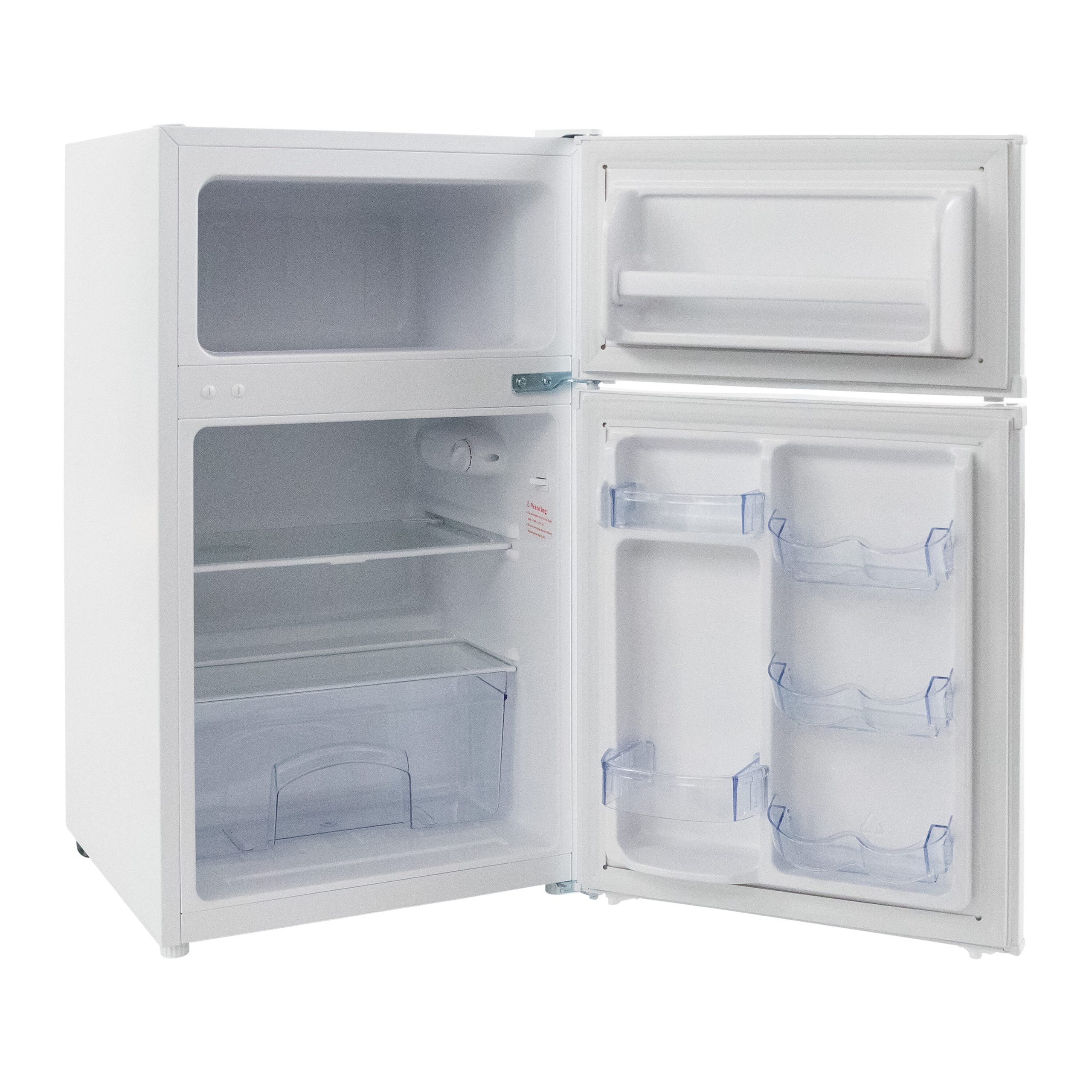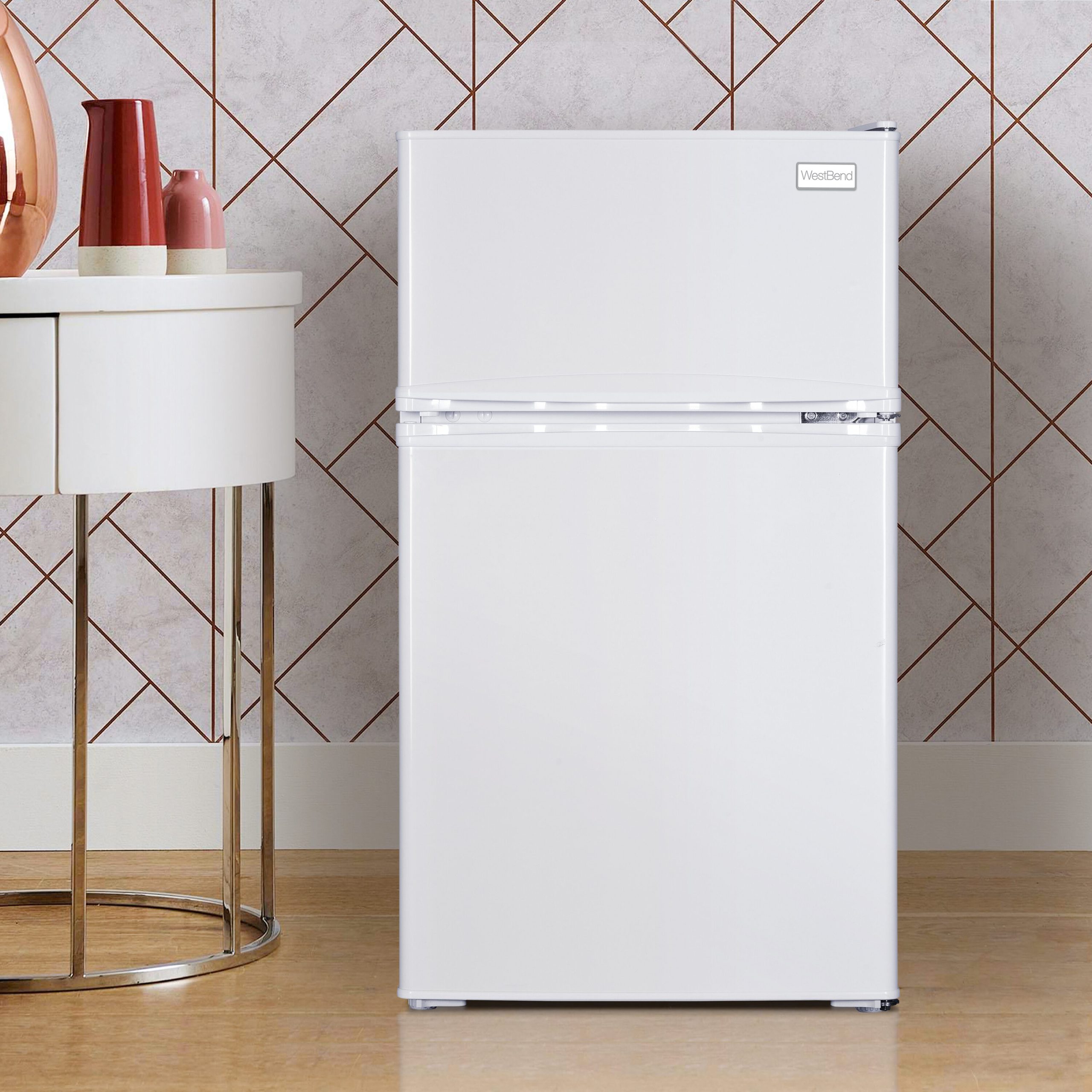 Keep your favorite beverages and snacks close by in the 3.1 cubic foot refrigerator from West Bend. Ideal for anywhere you need a little extra refrigerator and freezer space, the compact size makes it the perfect mini fridge with freezer for the office, dorm, man cave, she shed, bar, bedroom and more. Stock the 2.1 cubic foot mini fridge with bottled water and soda cans or try using it as a dedicated beer cooler or wine fridge. The built in door shelves can accommodate a 2 liter bottle and six 12 ounce cans, as well as other drinks, condiments and more. Arrange the adjustable glass shelves to store salads, fruits, snacks and other food for easy access throughout the day. The 1.0 cubic foot freezer is perfect for stocking up on pizza, ice cream and other frozen foods. This white mini fridge features automatic defrost, so your food and beverages remain fresh and cold. Select the right settings for your items with the full range temperature control. With a recessed door handle, flush back design and reversible door, this compact refrigerator is the perfect choice for any small space.