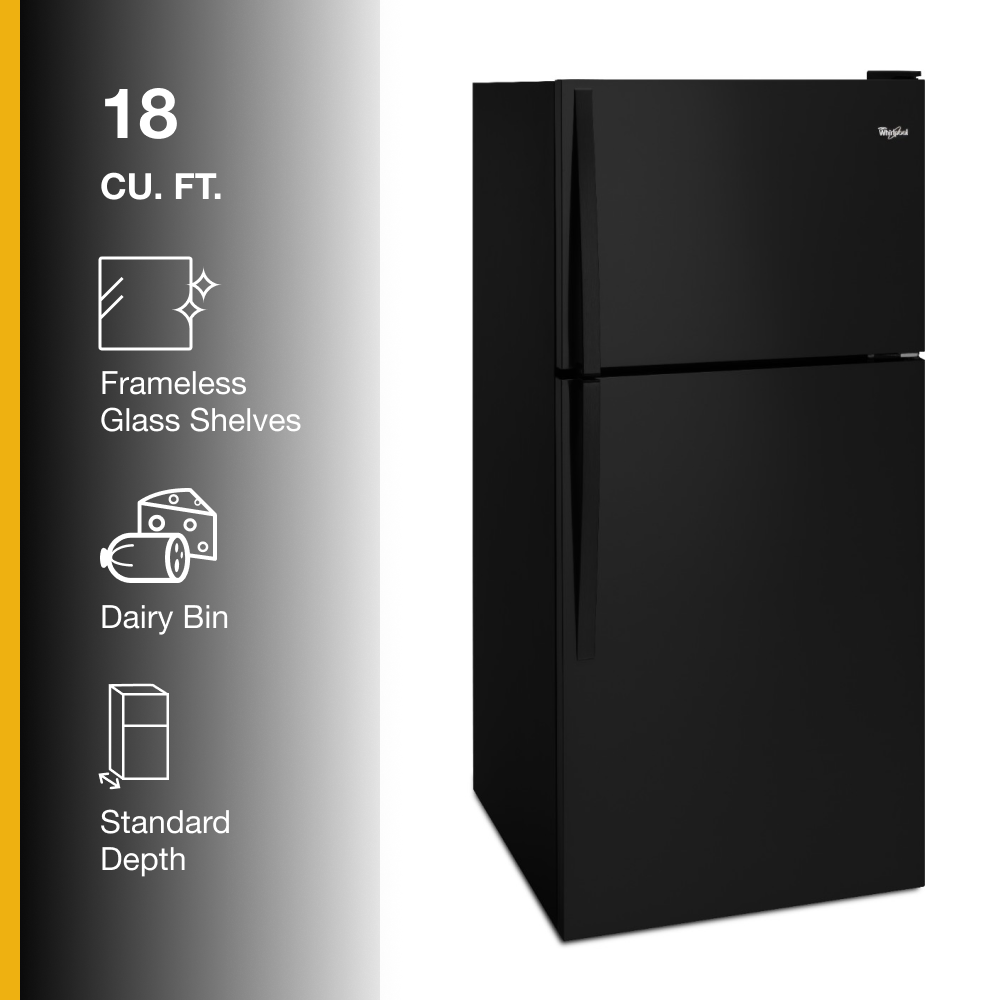 Classic looks, family-friendly capacity. This 18 cu ft top-freezer Whirlpool refrigerator has the capacity to store the fresh meats, cheeses, veggies, and frozen foods you enjoy the most. Thoughtful storage features like a flexible bin and open shelves on the doors simplify the task of organizing where groceries go and locating what you need later.