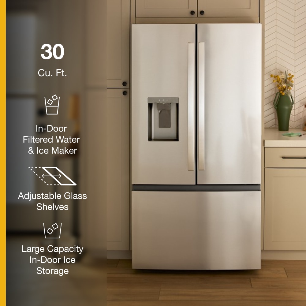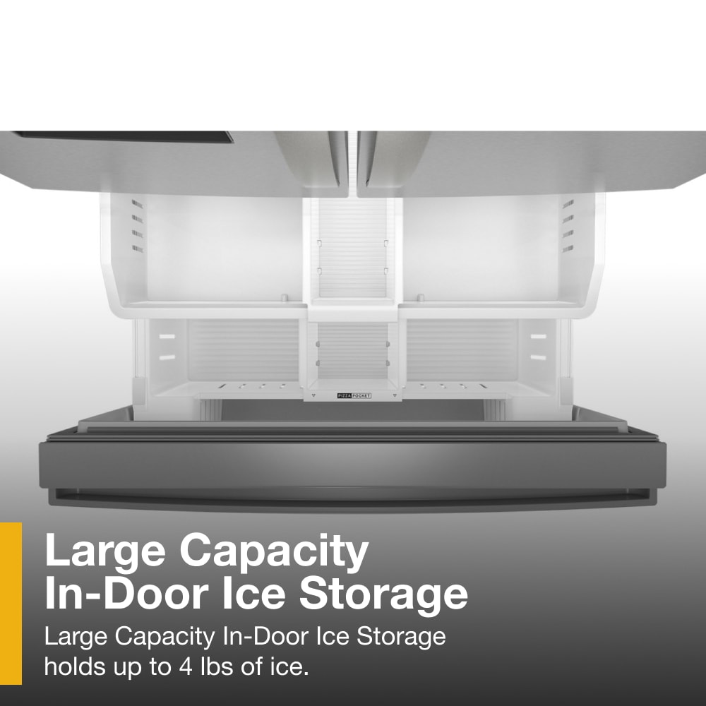Get family-sized capacity, ice and flexible organization to keep up with whatever the day brings. This Whirlpool® French Door Refrigerator makes over 3 lbs of ice every day. Fill up quick with the In-Door Filtered Water Dispenser & Ice Maker. Pint-Size Storage provides easy access to small items. And enjoy flexible storage with half and full Adjustable Glass Shelves. ENERGY STAR® certified.